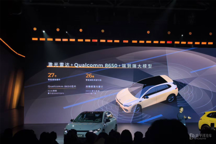 在智能驾驶辅助功能上,是由激光雷达+Qualcomm8650+端到端大模型构成,拥有全车27个传感器、其高精度激光雷达拥有300m最远探测和140°超广角,而Qualcomm8650芯片算力达200TOPS