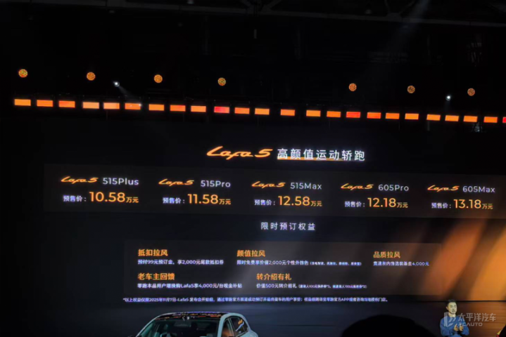 零跑Lafa5预售价车型预售价(万元)515Plus10.58515Pro11.58515Max12.58605Pro12.18605Max13.18
